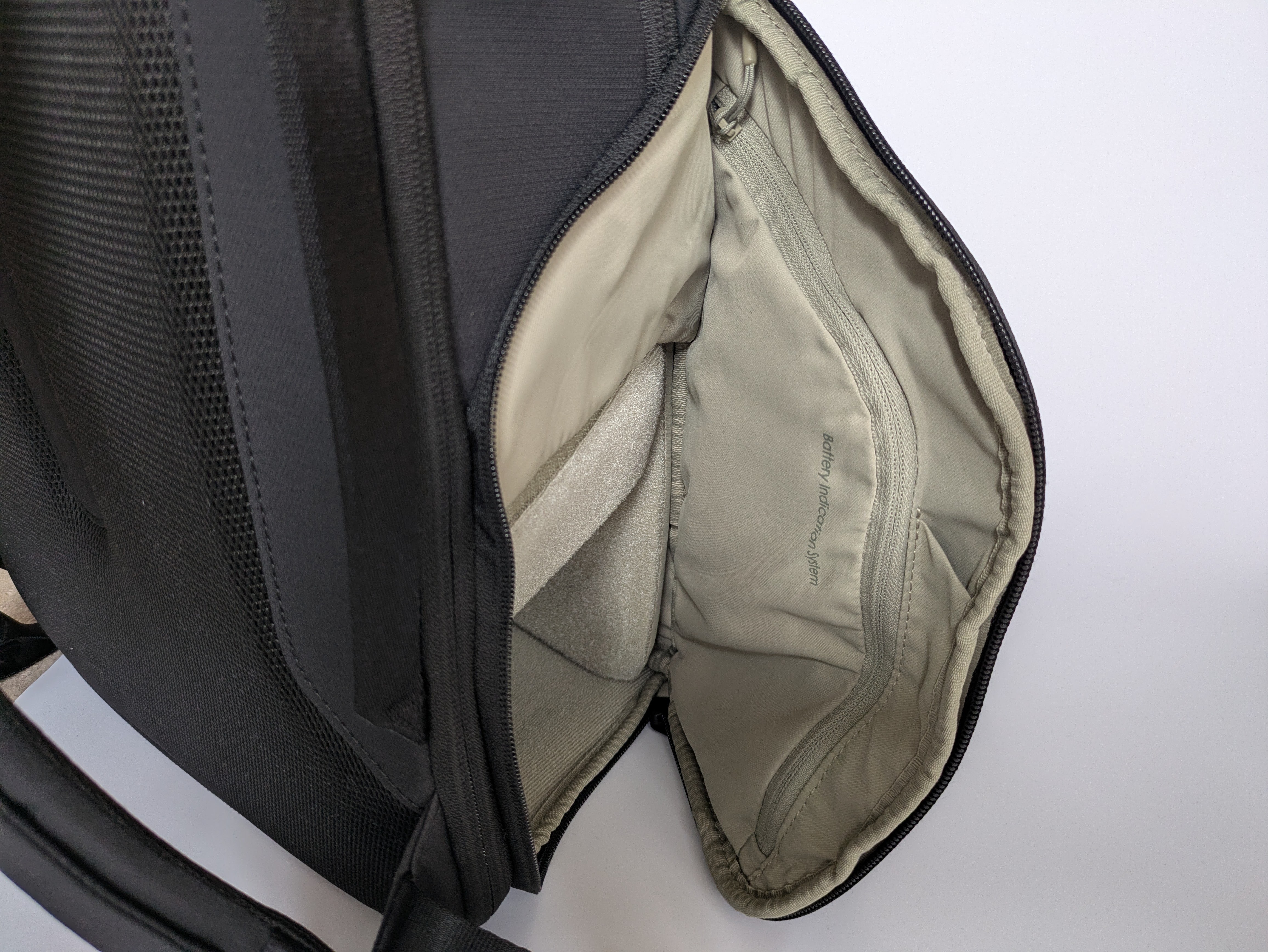 また、背面側には独立したPCスリーブが設けられており、最大16インチのMacBook Proまで収納可能です。クッション性も高く、大切なデバイスを安心して持ち運べるこの設計は、撮影先で編集作業も行うクリエイターにとって、非常に心強い味方です。(私はMacBookなんて高価なものは持っていないんですけどね…(笑))