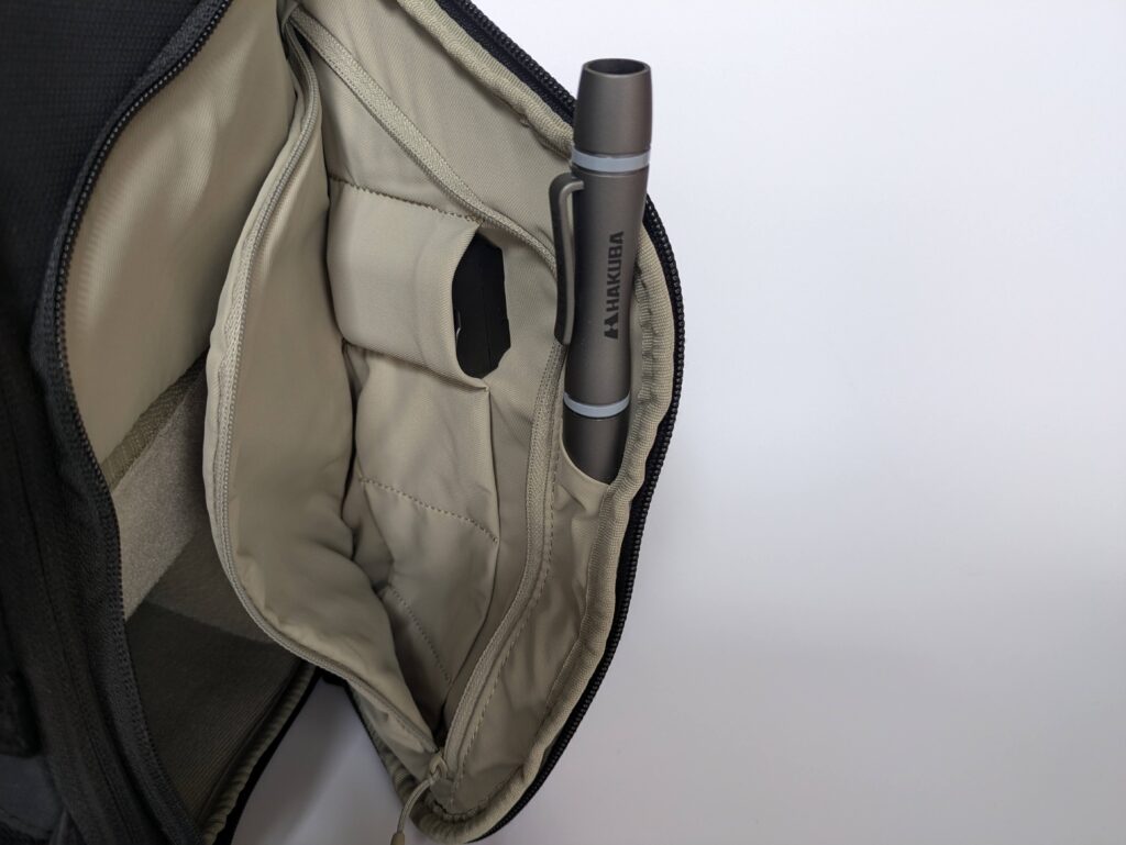 また、バッグの上部からもメイン収納にアクセスできるトップアクセスも非常に便利です。こちらにはカメラ以外の、例えば財布やイヤホン、サングラス、キーケースといった日常的に使う荷物を入れておくことで、移動中でも必要なものを素早く取り出すことができ、普段使いのバッグとしての利便性を大きく高めています。