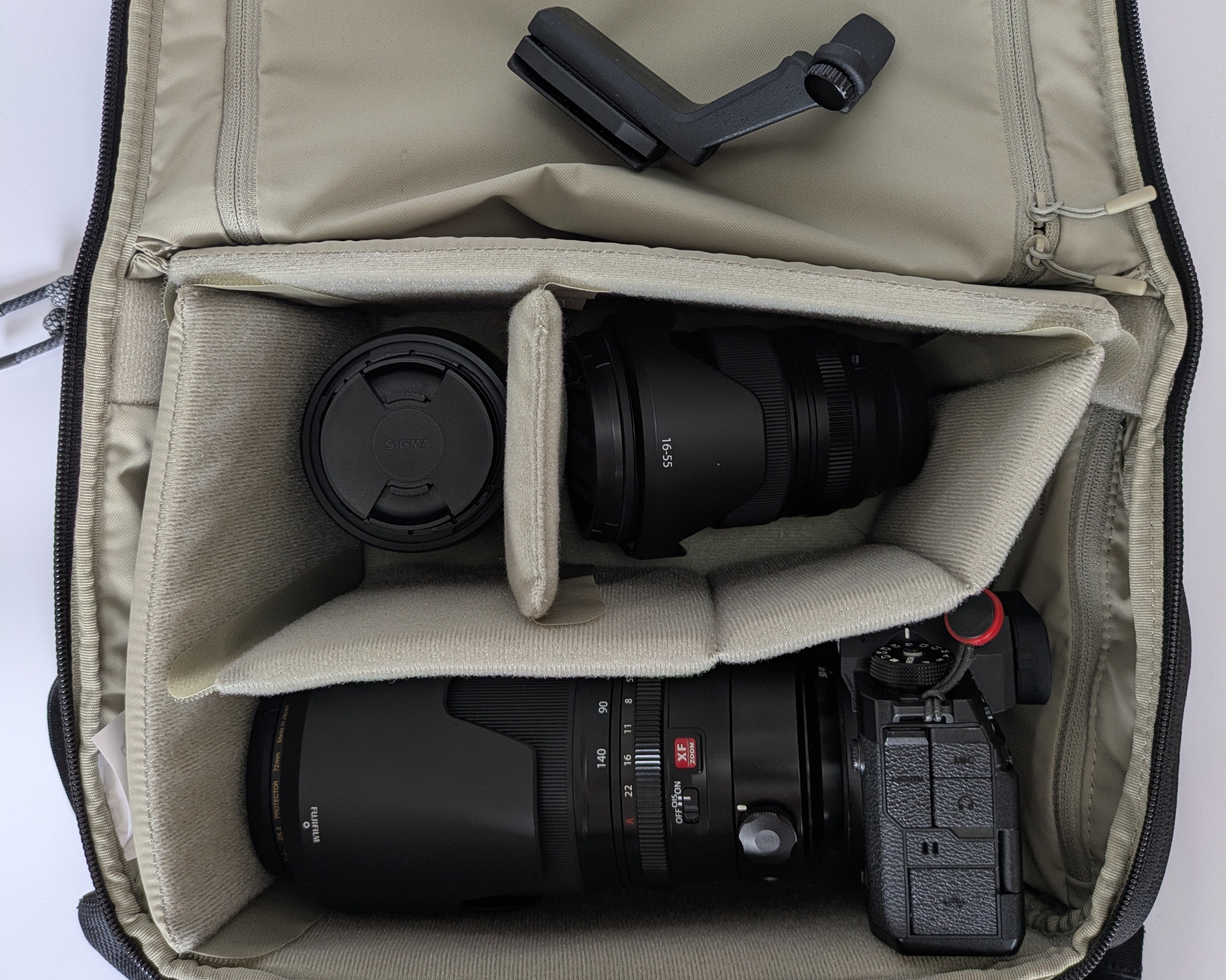 例えば、私の場合はX-H2のボディに大三元望遠ズームレンズのXF50-140mmを装着したまま、さらに大三元標準ズームレンズのXF16-55mmとSIGMAの単焦点中望遠レンズの56mmを収納できてしまいます。(XF50-140mmの三脚座も付けたままは無理でしたが…。)